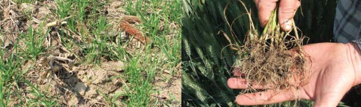 9. ábra. A: Helytelen talajmûvelés és növényi maradvány lebomlás ôszi búza vetésben;