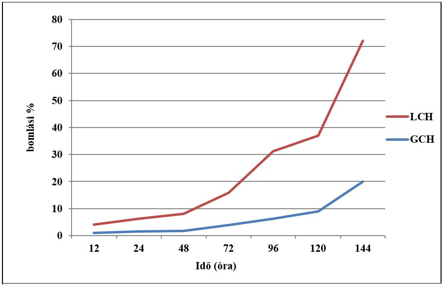 1. ábra Az LCH (lambda-cihalotrin) és a GCH (gamma-cihalotrin – Rapid® CS) fénystabilitása UV csatornában