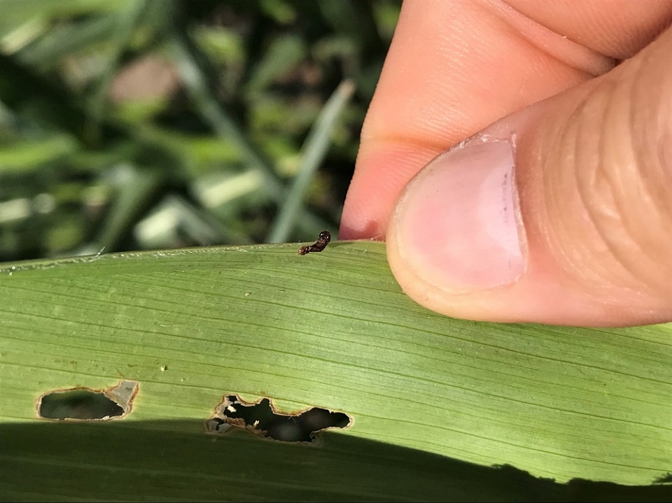 Coragen®-es kezelés eredményeként elpusztult fiatal kukoricamoly lárva levélen, Kondoros, 2019 (Fotó: Hőgye Szabolcs)